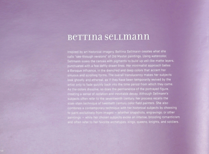 Bettina Sellmann uses interesting technique to play with time and summon subjective responses to popular art and art history. Her washy watercolor-on-canvas subjects are frequently baroque and romantic; they are quaintly dated and reminiscent of kitschy things like figurines and cheap prints that, not so long ago, accented grandmother’s ersatz-Louis Quinze parlor décor.